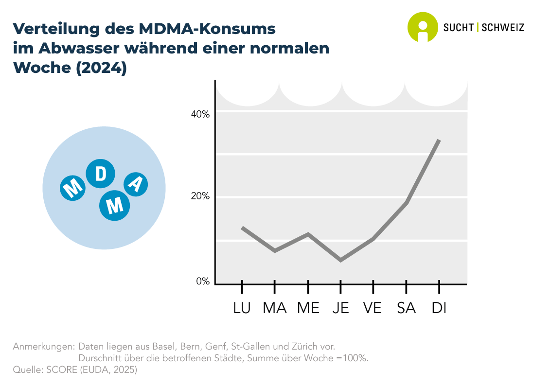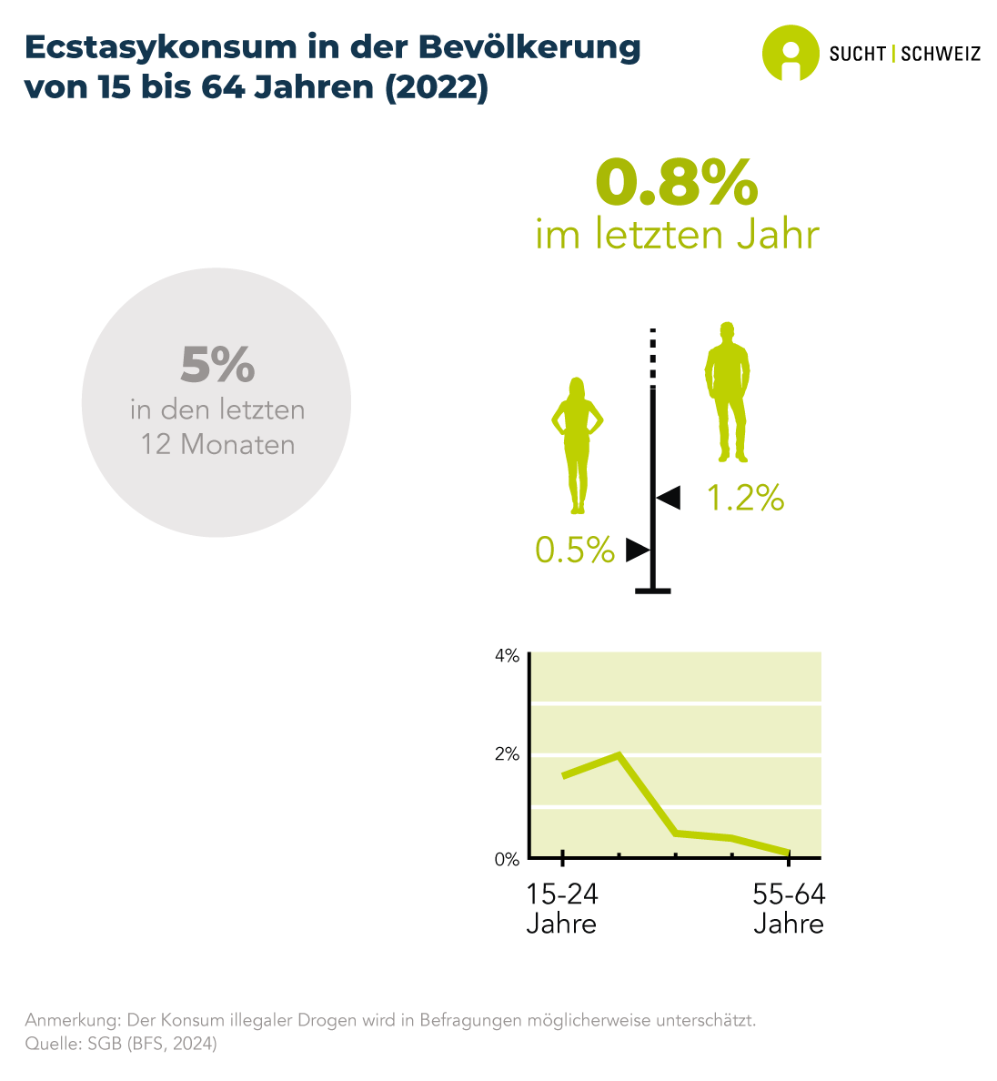 5.3% der Bevölkerung von 15 bis 64 Jahren haben in ihrem Leben bereits Ecstasy konsumiert. 0.8% haben es im letzten Jahr genommen. Der Ecstasykonsum im vergangenen Jahr ist unter jungen Personen stärker verbreitet. Bei Männern (1.2%) ist er häufiger als bei Frauen (0.5%) (Daten für 2022).