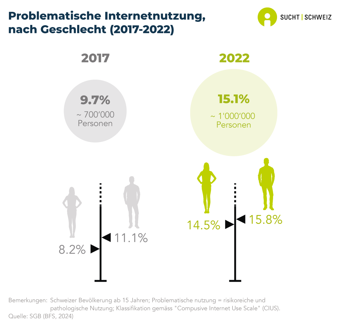 Im Jahr 2023 nutzten in der Schweiz 92% der Bevölkerung ab 15 Jahren das Internet täglich, und etwa 15% hatten eine problematische Nutzung.
