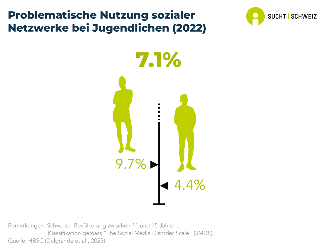 Im Jahr 2022 wiesen etwa 7% der 11- bis 15-Jährigen eine problematische Nutzung sozialer Netzwerke auf. Das ist mehr als im Jahr 2018 (~4%). Mädchen (ca. 10%) waren stärker betroffen als Jungen (ca. 4%).