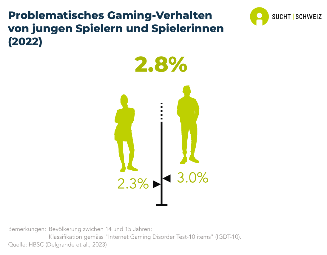 Im Jahr 2022 wiesen etwa 3% der 14- und 15-Jährigen, die gamen, ein problematisches Gaming-Verhalten auf, ohne nennenswerte Unterschiede nach Geschlecht und Alter.