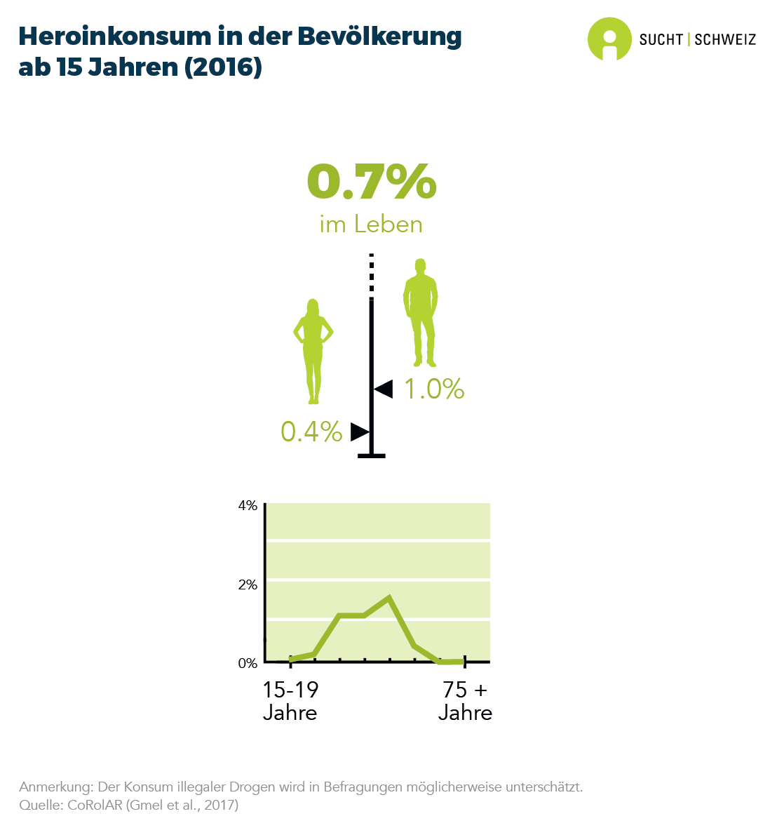 0.7% der Personen ab 15 Jahren haben in ihrem Leben Heroin konsumiert. Der Konsum von Heroin ist im Alter von 25 bis 54 am stärksten verbreitet. Und er kommt unter Männern (1.0%) häufiger vor als unter Frauen (0.4%) (Daten für 2016).